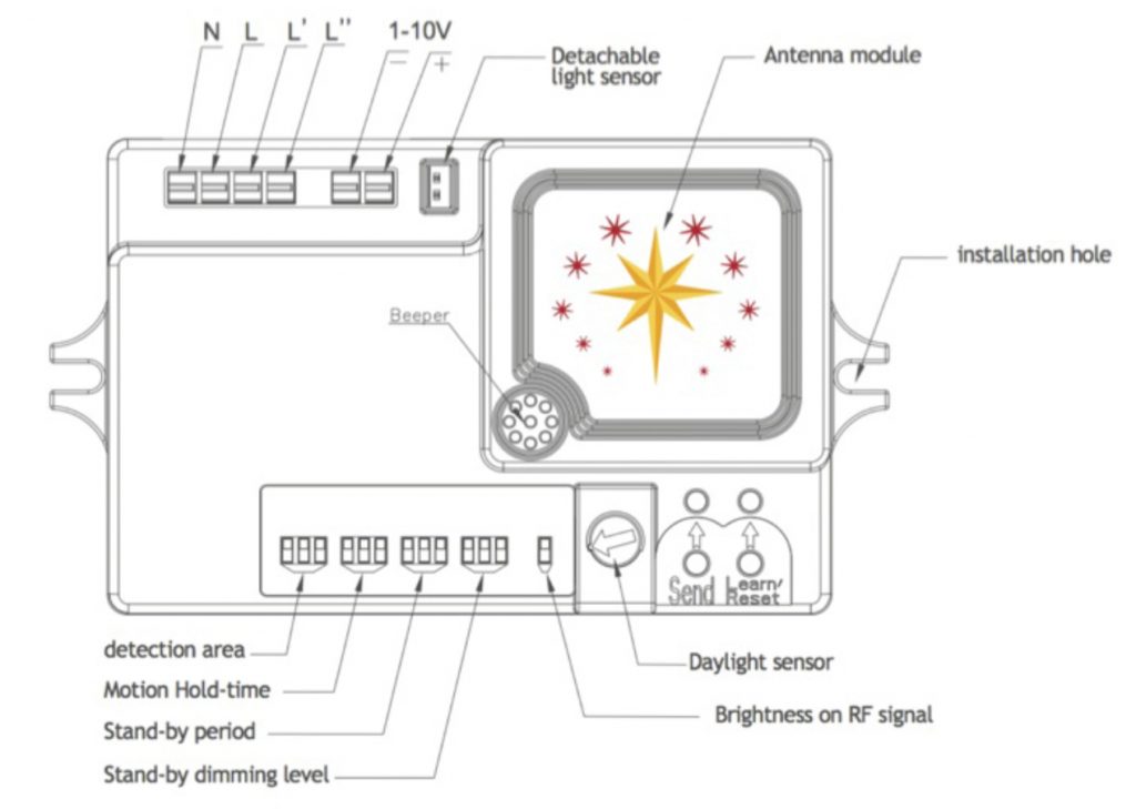 DIP selectable after installation Detection Area Hold Time Daylight Sensor (To be purchased separately) |