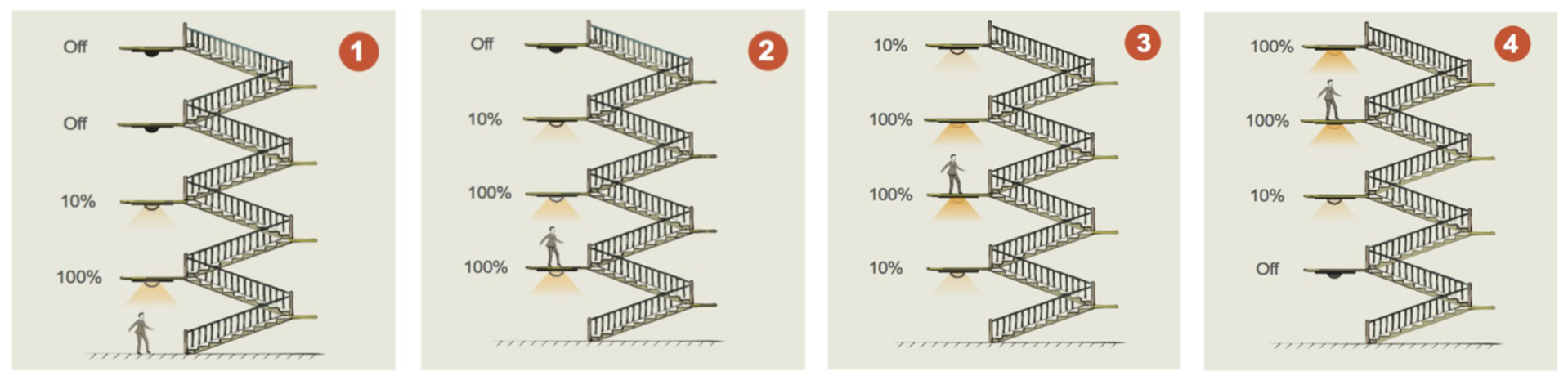 Follow Through Lighting — Trigger Zone, Hold time, Half Dim, Daylight